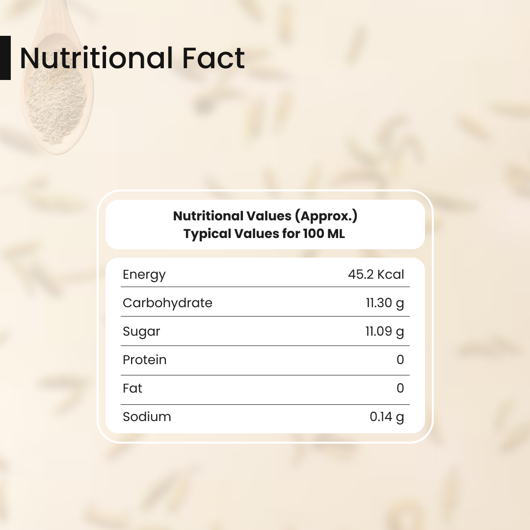 Nutritional Values (Approx Typical Values for 100 ML Energy 45.2 Kcal | Carbohydrate 11.30 g | Sugar 11.09 g | Protein 0 | Fat 0 | Sodium 0.14 g