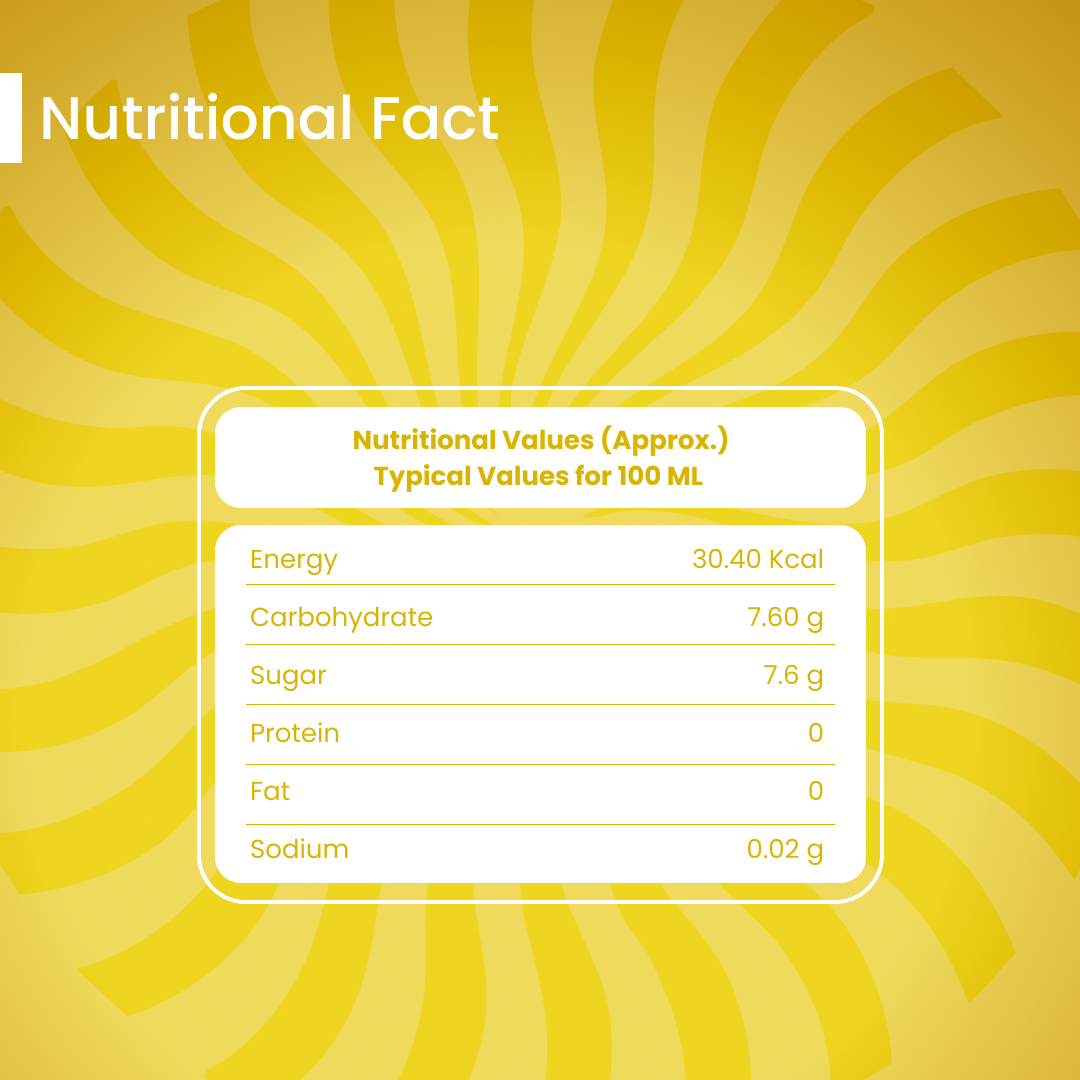 Nutritional Values (Approx Typical Values for 100 ML Energy 30.40 Kcal | Carbohydrate 7.60 g | Sugar 7.6 g | Protein 0 | Fat 0 | Sodium 0.02 g
