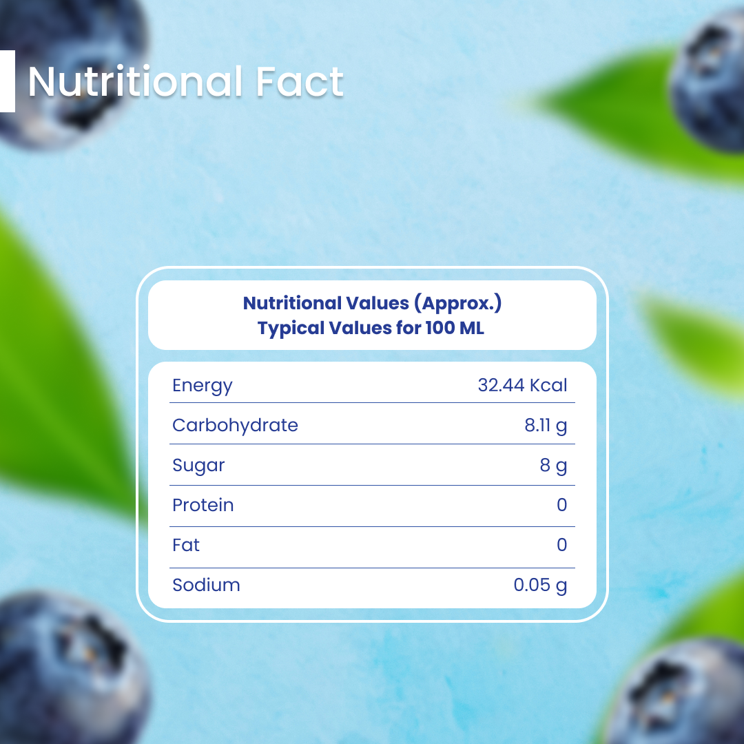 Nutritional Values (Approx Typical Values for 100 ML Energy 32.44 Kcal | Carbohydrate 8.11 g | Sugar 8 g | Protein 0 | Fat 0 | Sodium 0.05 g